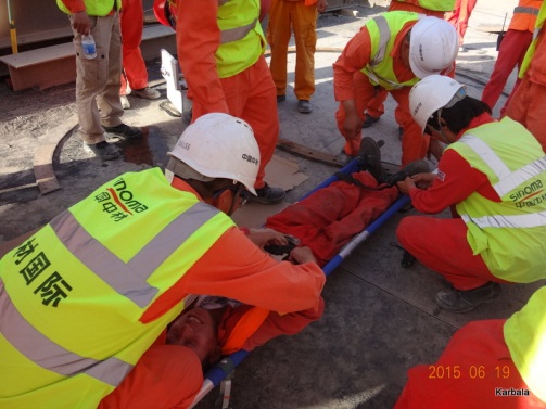 伊拉克卡爾巴拉項(xiàng)目部根據(jù)目前工地正逢高溫氣候季節(jié)和施工繁忙階段,針對性分別開展了受限空間作業(yè)突發(fā)事故和高溫環(huán)境下作業(yè)發(fā)生中暑的應(yīng)急救援演練。
