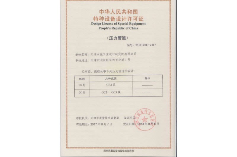 8月8日,中材國際天津公司正式獲得天津市質量技術監督局頒發的壓力管道設計許可證書,為相關業務的開展奠定了良好基礎。