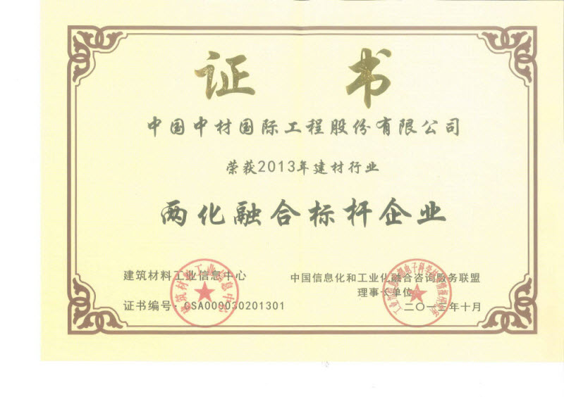 2013年10月12日,由工業和信息化部信息化推進司指導,工業和信息化部電子科學技術情報研究所主辦的“兩化深度融合專項行動計劃重點工作推進大會”,在北京萬壽賓館順利召開。大會圍繞《信息化和工業化深度融合專項行動計劃(2013-2018年)》的重點工作進行了研討和典型經驗交流。工業和信息化部副部長楊學山出席并發表講話,工業和信息化部信息化推進司徐愈司長,工業和信息化部消費品工業司、國家信息化專家咨詢委員會秘書處、國資委信息中心的領導,以及各省、自治區、直轄市、副省級以上城市的工信主管部門、協會、地方兩化融合支撐服務機構、相關企事業單位和新聞媒體400余位代表參加了本次會議。會上,發布了行業兩化融合評估系列成果并評選了兩化融合標桿企業,中材國際獲得2013年建材行業兩化融合標桿企業的殊榮。