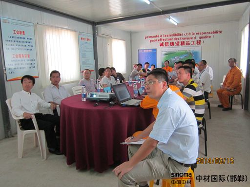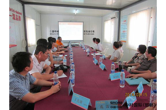 當地時間3月15日10時,中華人民共和國駐喀麥隆使領館在中材國際工程股份有限公司邯鄲工程建設分公司喀麥隆項目部隆重召開駐喀中資企業交流會,近20家中資企業代表歡聚一堂。與會企業有中材國際、中石化、中地海外、中國港灣、中交、山西建工、華山國際、沈陽國際、山東科瑞、華為等30多名代表參會。喀麥隆項目經理張義、黨支部書記趙書啟、安裝經理丁光雄、安全經理王先平等參加了本次會議。