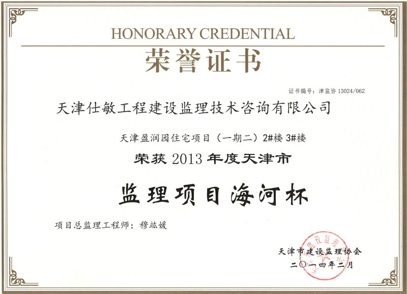 近日,由中材國際天津公司旗下的仕敏監理公司負責監理的天津盈潤園住宅項目(一期二)2#、3#樓項目獲得2013年度天津市“監理項目海河杯”。