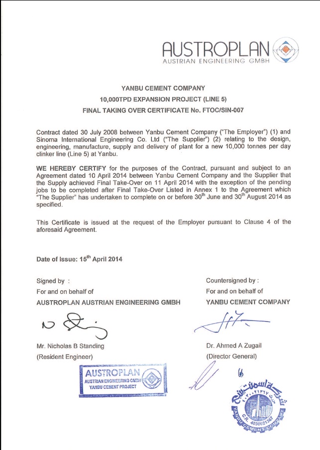 2014年4月15日,由中材國(guó)際(南京)承擔(dān)建設(shè)的沙特YCC萬(wàn)噸線項(xiàng)目獲得業(yè)主和咨詢公司頒發(fā)的最終接收證書(shū)(FTOC),為項(xiàng)目的成功完美履約畫上了圓滿的句號(hào)。