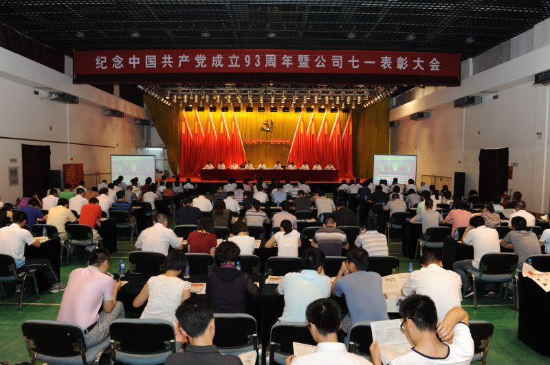 7月1日下午,中材國際天津公司的職工體育活動中心內,八面鮮紅的黨旗整齊莊嚴地排列在主席臺后,黨旗中間一枚神圣的黨徽在燈光下閃耀著金色光芒,黨徽下1921-2014幾個數字仿佛正娓娓講述著中國共產黨成立93年來經歷的歷史故事。