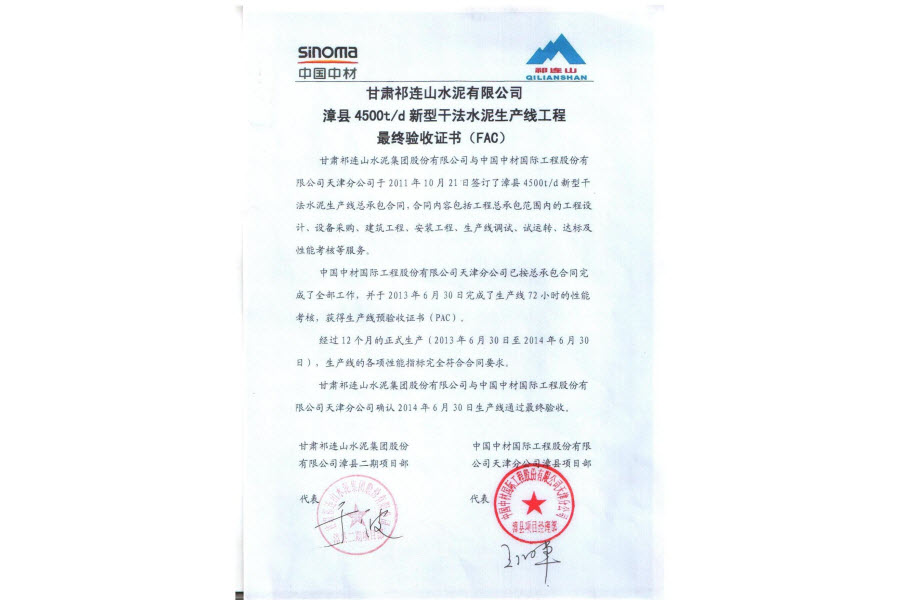6月30日,由中材國際天津公司總承包的甘肅祁連山水泥有限公司漳縣4500t/d新型干法水泥生產線工程順利獲得業主頒發的生產線最終驗收證書(FAC),這標志著該項目執行工作圓滿結束。