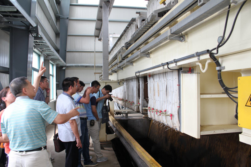 會(huì)后,孫偉、胡芝娟一行帶領(lǐng)大家參觀了由天津公司工程研究中心建設(shè)的桐鄉(xiāng)100t/d污泥深度脫水減量化示范工程項(xiàng)目。親眼目睹了污泥調(diào)質(zhì)、壓濾、泥餅卸料等整個(gè)污泥脫水流程,尤其是泥餅的卸料過程后,大家均感到很震撼。本污泥脫水項(xiàng)目直接對(duì)含水率95%的濃縮污泥進(jìn)行化學(xué)調(diào)理,調(diào)質(zhì)后污泥經(jīng)過壓濾脫水后,脫水泥餅含水率降低至50%,體積減少至原來的十分之一,成功實(shí)現(xiàn)污泥的減量化,藥劑成本低,經(jīng)濟(jì)性顯著。