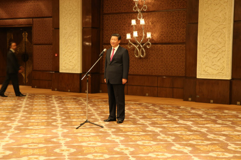 上午10時,習主席和夫人一行與中資企業代表合影留念。隨后,習近平主席發表了即興演講,首先表達了黨中央對于全體中資企業駐印工作人員的親切問候,隨后就國際國內經濟文化的現狀與愿景、中國夢及民生等問題發表了深刻而獨到的見解,并對駐外人員的生活和學習提出了殷切希望。
