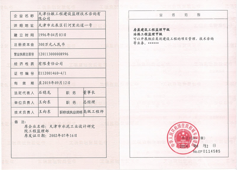 近日,天津水泥工業設計研究院有限公司下屬的仕敏監理公司順利通過了房屋建筑工程專業甲級、冶煉工程甲級資質的審批。