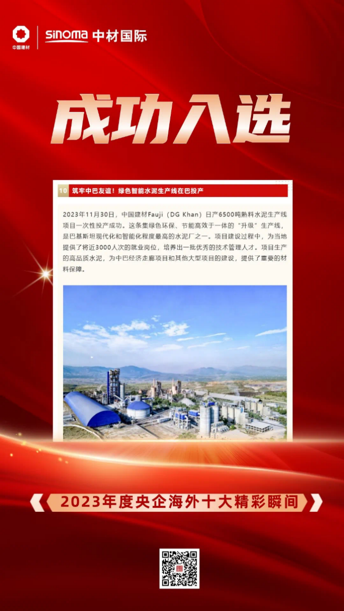 2023年12月24日,“國資小新”聯合國務院國資委網站、《國資報告》雜志推薦20個央企海外精彩瞬間并在“國資小新”、國資報告新媒體平臺發起投票,綜合各平臺網友投票情況和專家意見“2023年度央企海外十大精彩瞬間”燃情上映!中材國際所屬合肥院總承包、邯鄲中材承建的巴基斯坦Fauji(DG Khan)日產6500噸熟料水泥生產線項目成功入選!